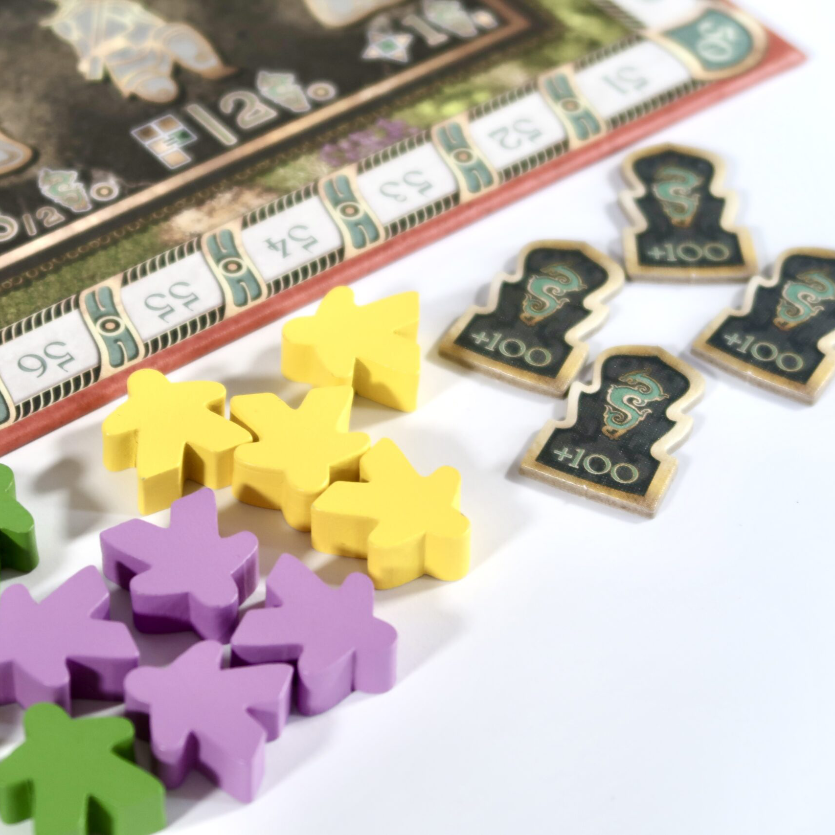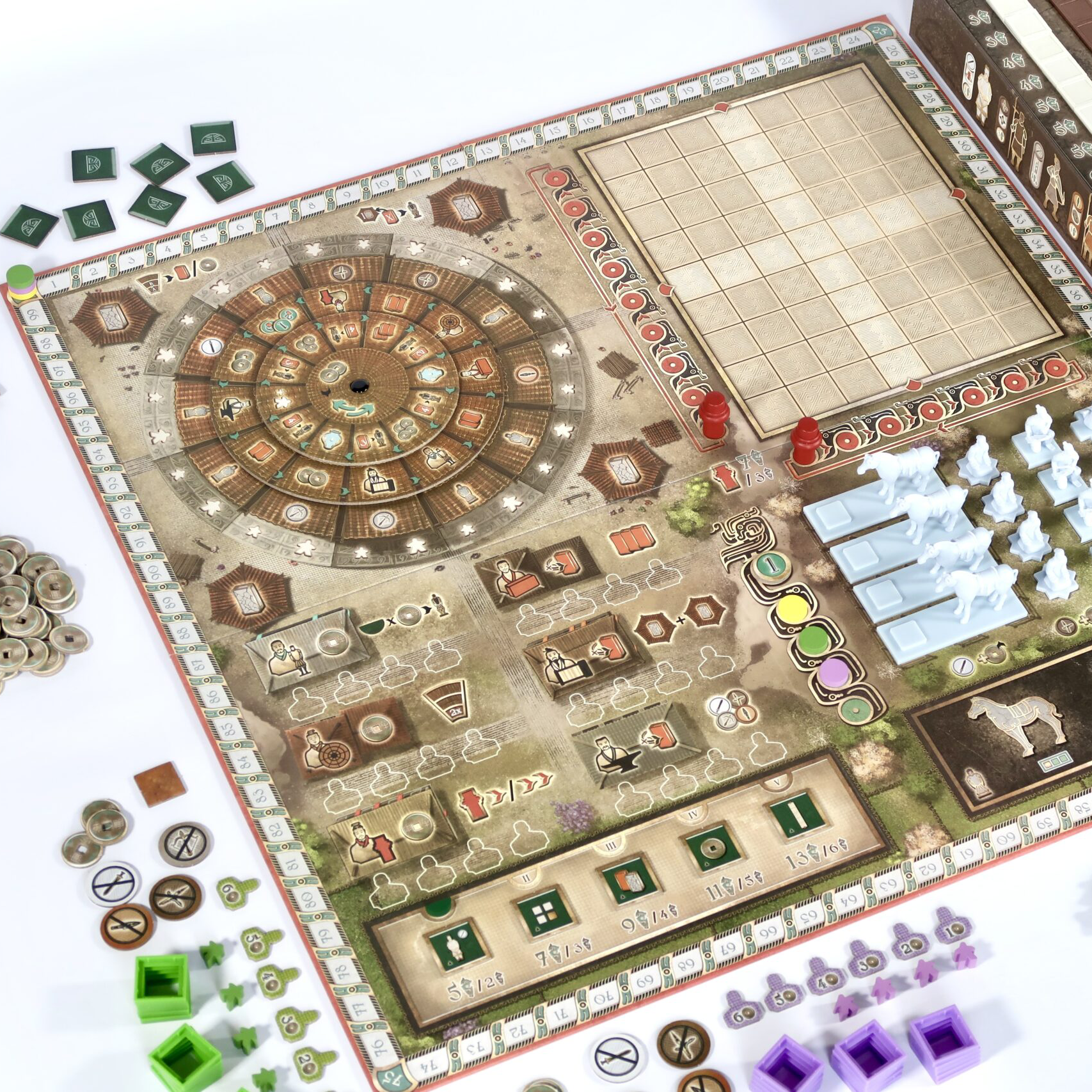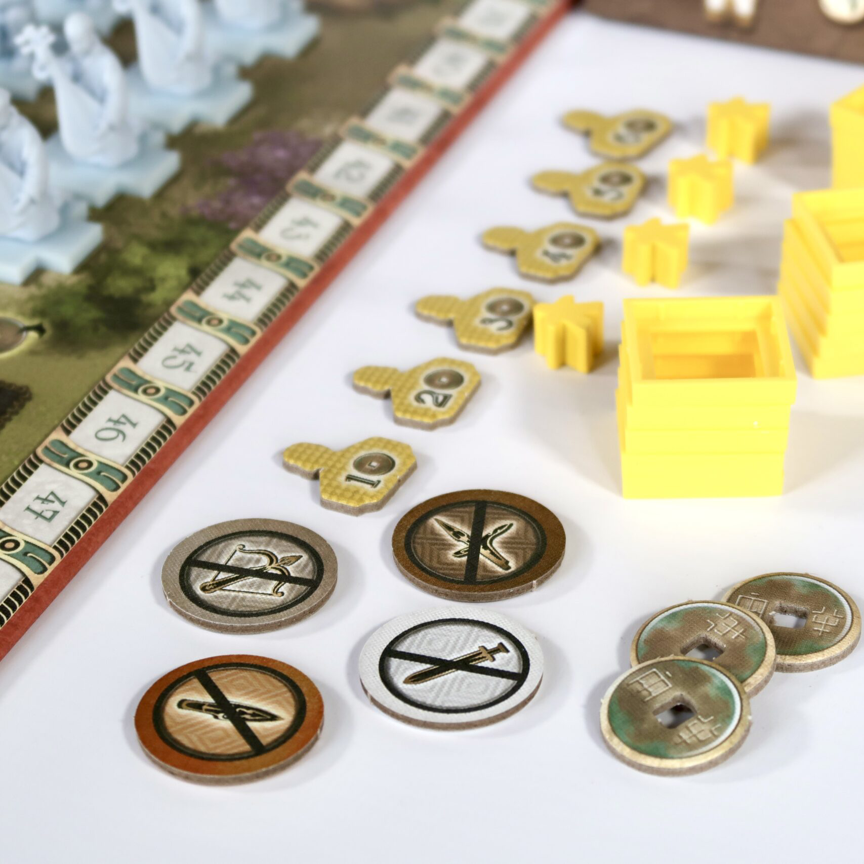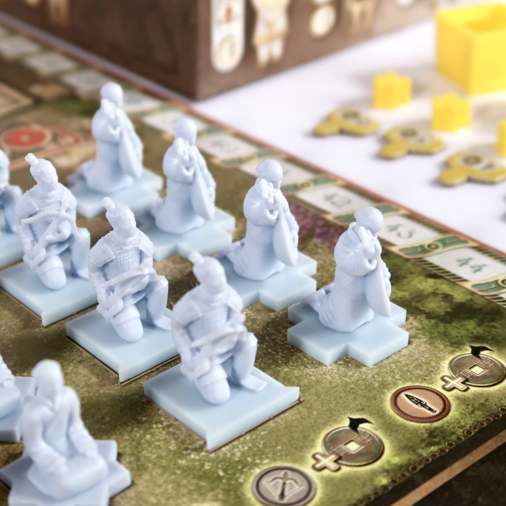 In Terracotta Army, you represent talented craftsmen and artists laboring to build the wondrous assembly of statues. During the game, you collect resources, upgrade your workers, and seek favor with the Emperor's advisors. Your goal is to play a crucial role in the process of creating the terracotta army, and your success is measured in victory points (VPs). During the game, you and your fellow players build the army together, but after the fifth round of the game is over, only one of you — the one with the most points — will stand as the winner. During the game, you place warrior miniatures within the mausoleum, forming groups. A group's miniatures may belong to multiple players as denoted by the player bases on those miniatures. Multiple separate groups consisting of the same type of miniature may exist within the mausoleum.