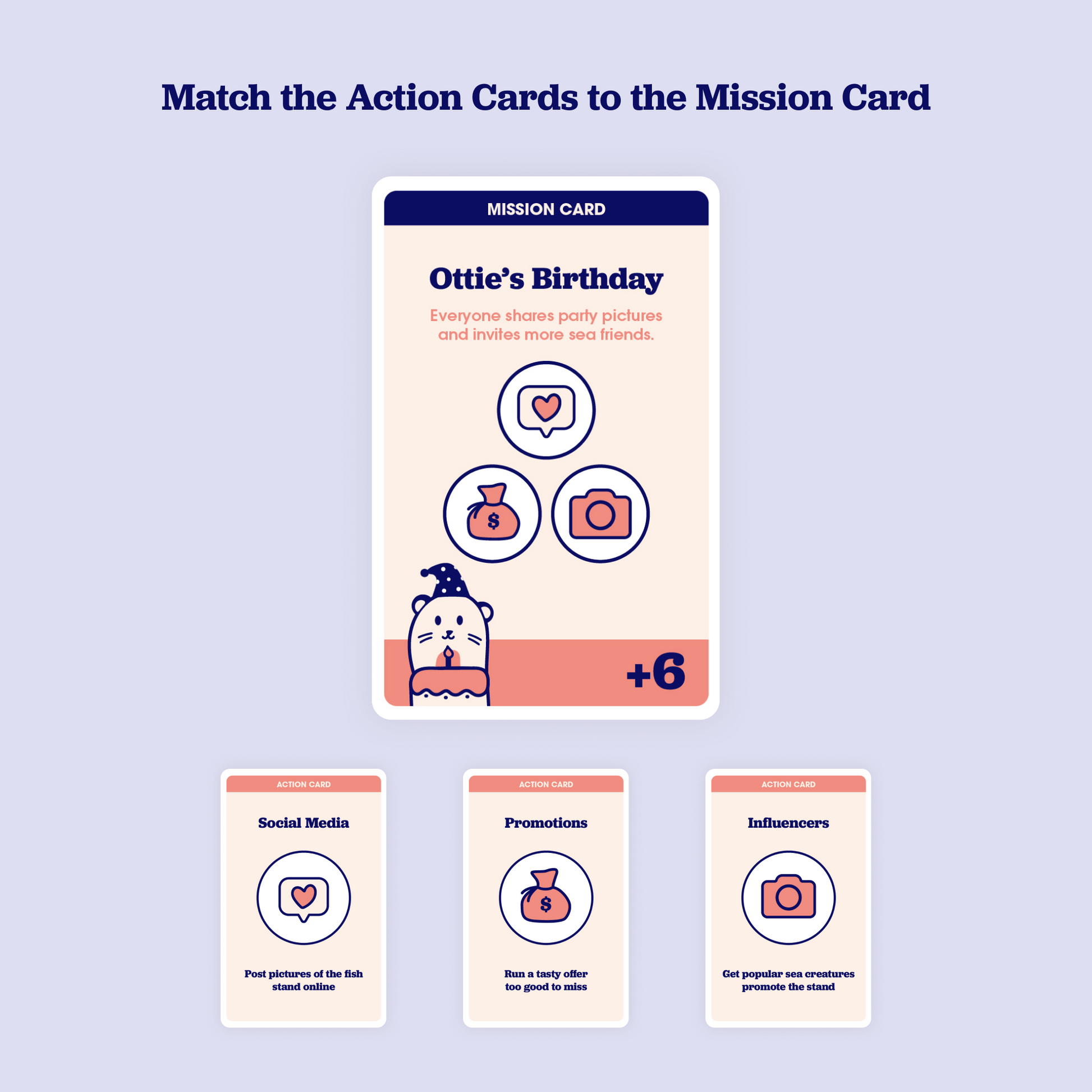 - Each Mission Card describes a scenario Ottie faces — like Ottie’s Birthday Sale or Ocean Cleanup.