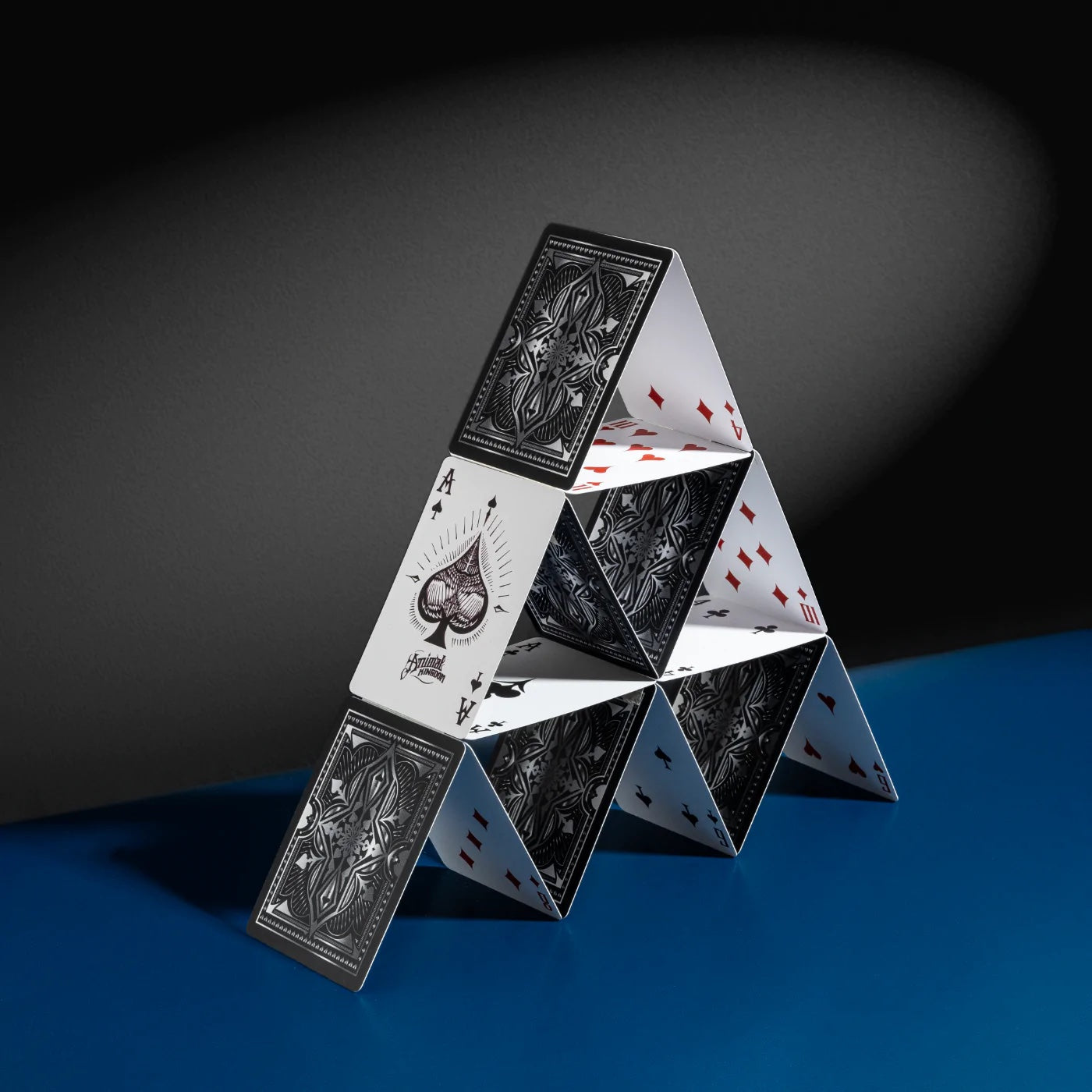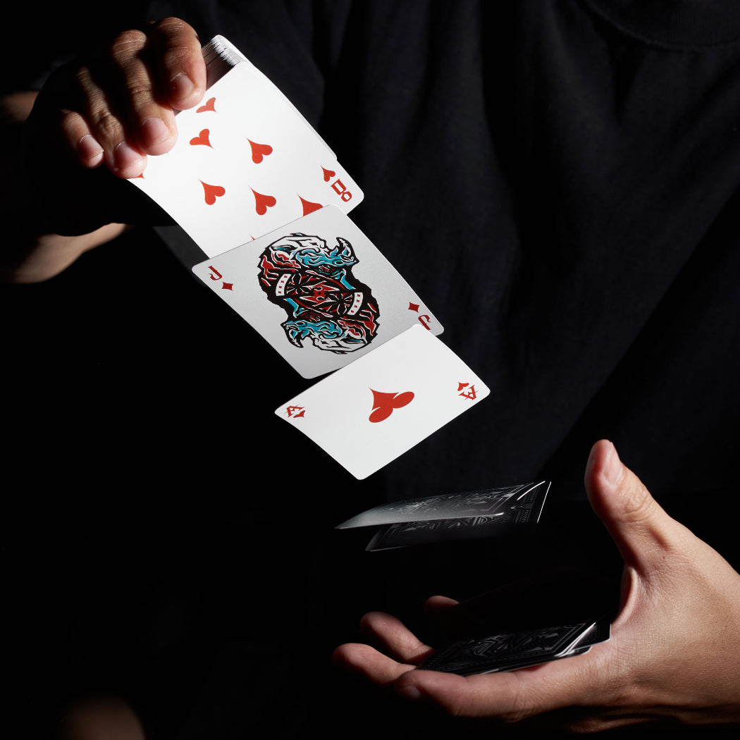 The underlying inspiration of these artworks from dark woodcut technique, expresses a fierce yet mystic vibe. Meticulously produced with plastic material alongside a matte finish, Animal Kingdom deck of cards offers a smooth shuffle and wrinkle-free experience. The contrast of dark vs bright sides by mirror style with a splash of selected colours will be absolutely eye-catching.
