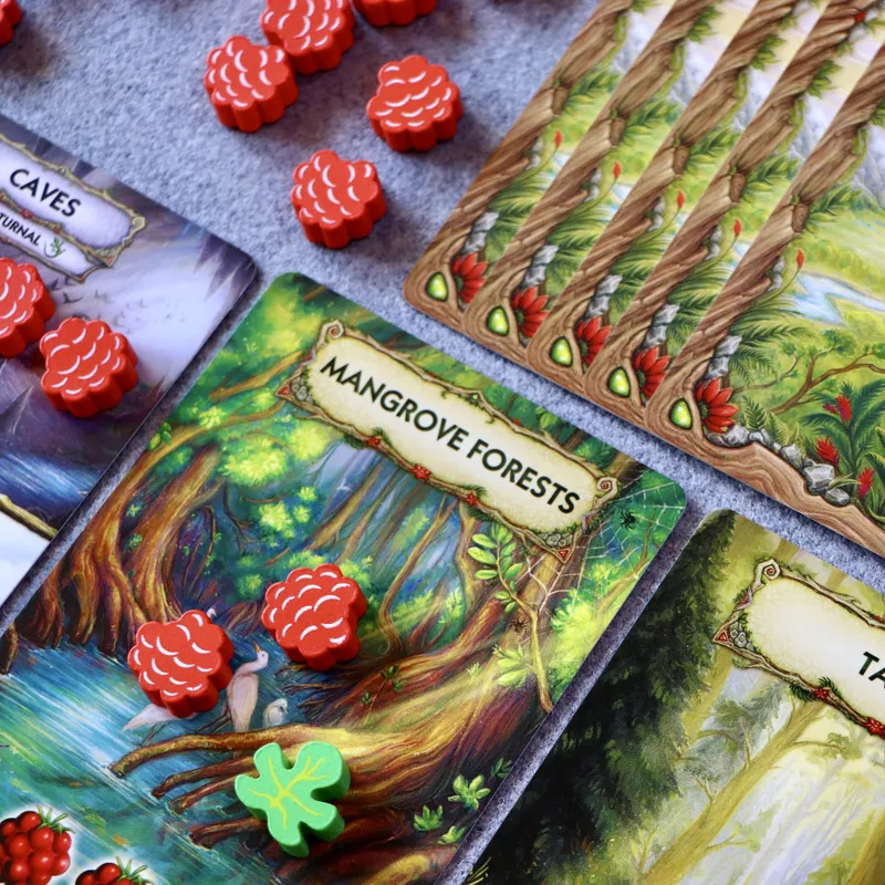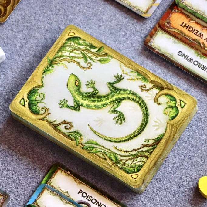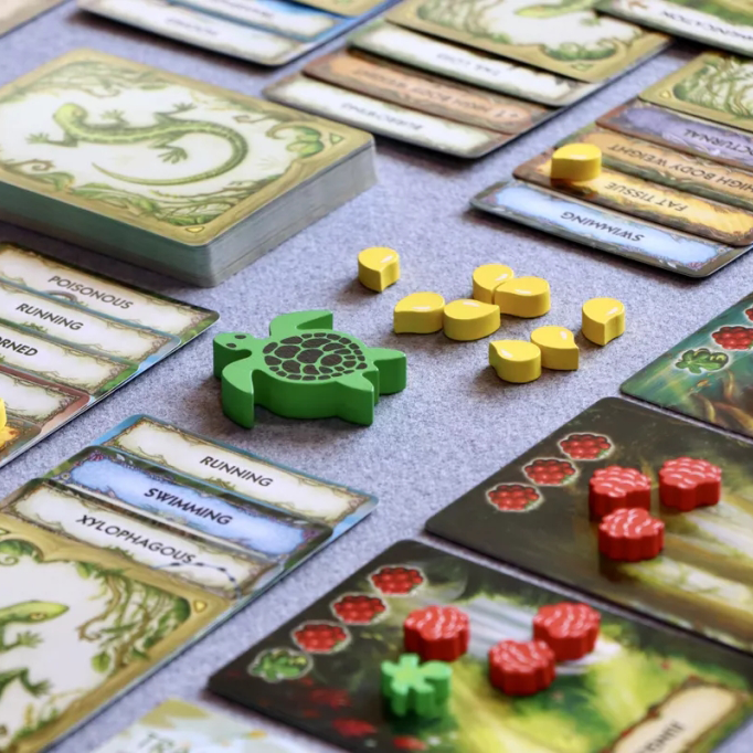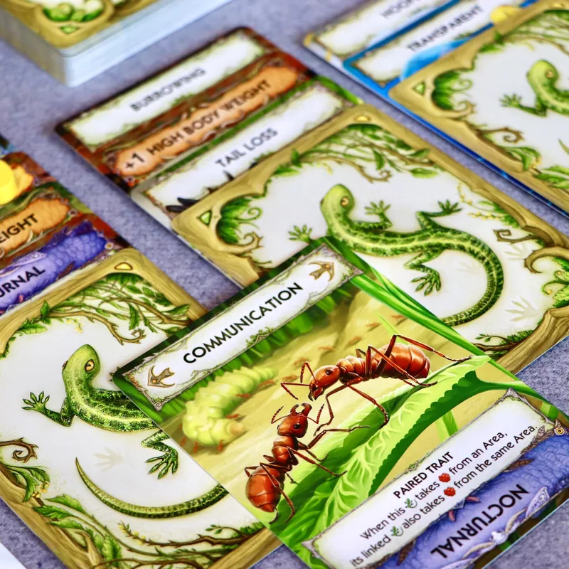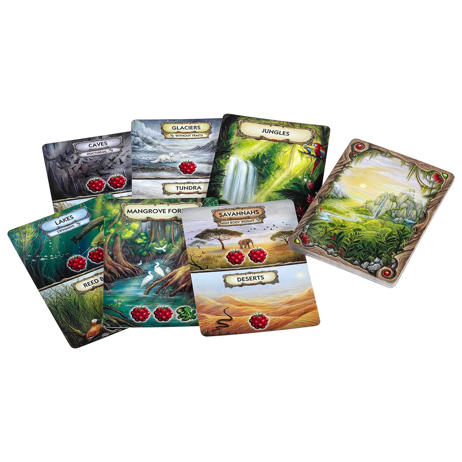 Over the course of six epochs, your successful animals evolve and produce food, while poorly adapted species become extinct or fall prey to predators. The game includes traits based on the anatomy and behavior of real animals inhabiting our planet, accompanied by scientific descriptions and examples of how these traits are used. The game’s cards have colorful illustrations in the spirit of historical zoology artwork.