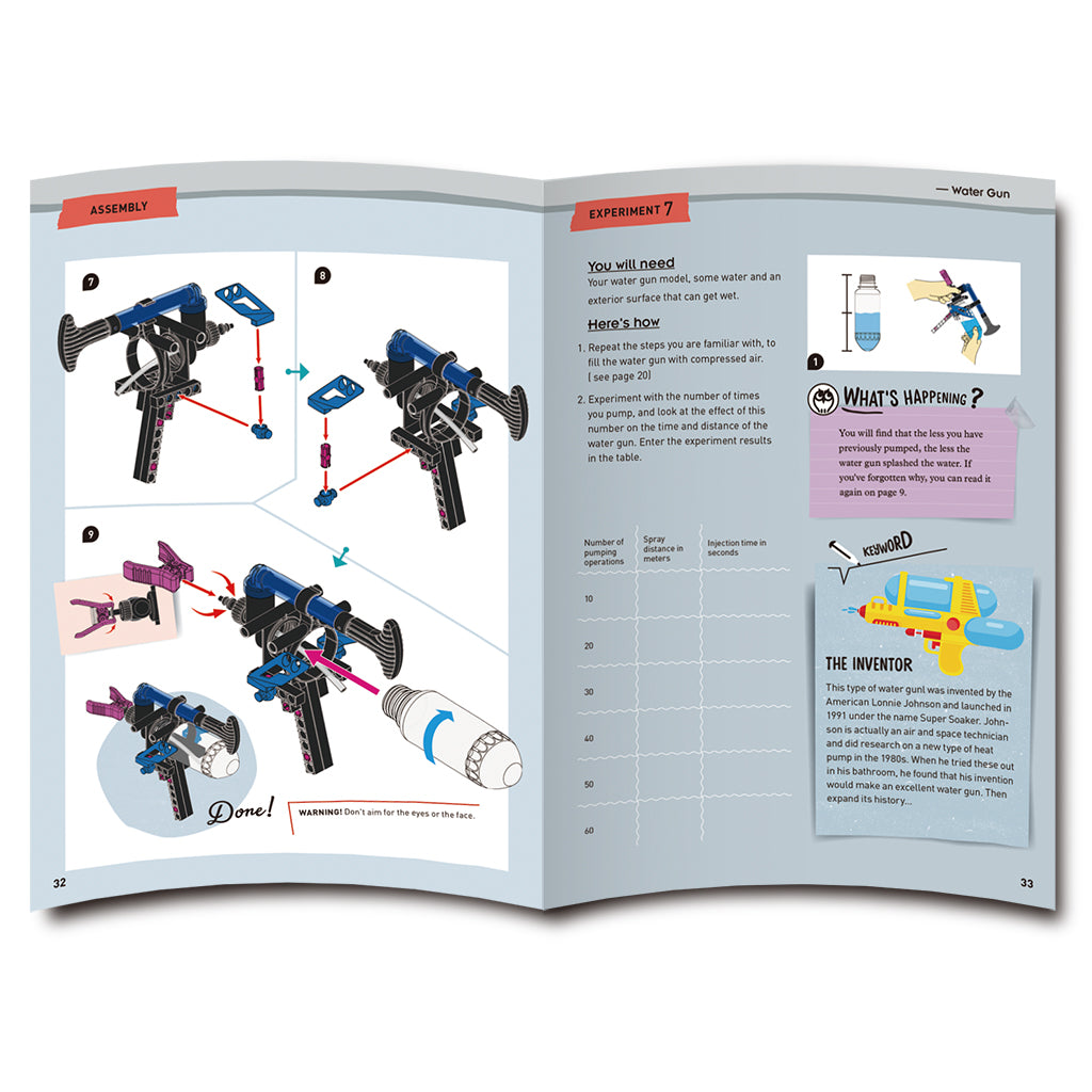 Let's build six awesome water power models! This product contains 47 components that can make two cars, two boats, a sprinkler and a water gun. With this kit, you can discover the driving force of water, and learn about the compressed air. The compressed air used in this product, is one of the oldest energy sources, and this technology is still used in many machines today. Through this experiment set, children can build many exciting models and learn to drive them with compressed air and water. You can discover the fun of scientific experiments in the process, and these models will definitely get you wet!