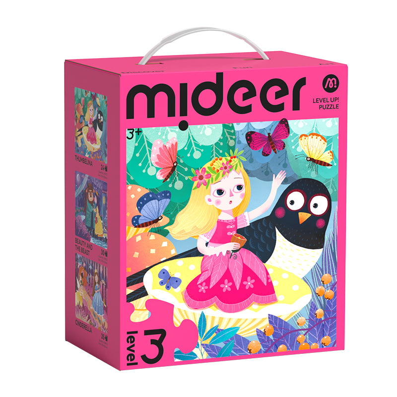 Level 3: Princesses theme has 3 puzzles in 1 box & features 3 fairy tale scenes including Thumbelina, Cinderella anb Beauty and the Beast.