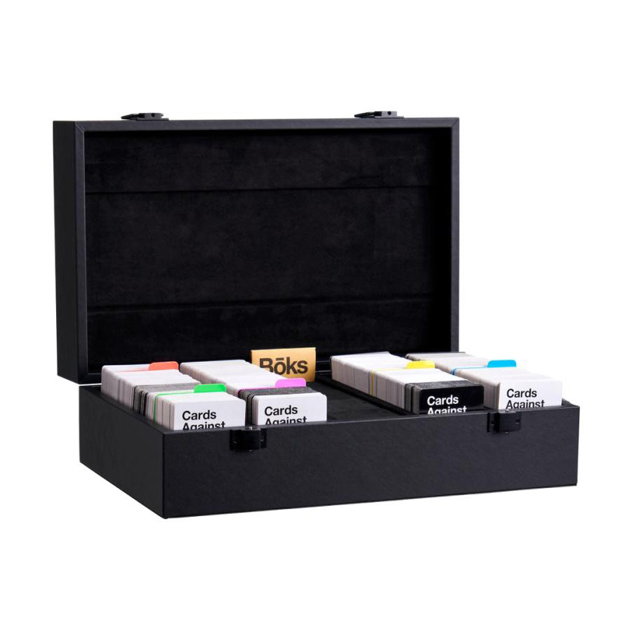 Includes everything Boks comes with, as well as all the cards from the Red, Blue, Green, Absurd, and Everything Boxes, the 90s and 2000s Nostalgia Packs, the Pride, Dad, Science, College, and Food Packs, and Picture Card Packs 1, 2, and 3 — plus 100 blank cards for your bad ideas.