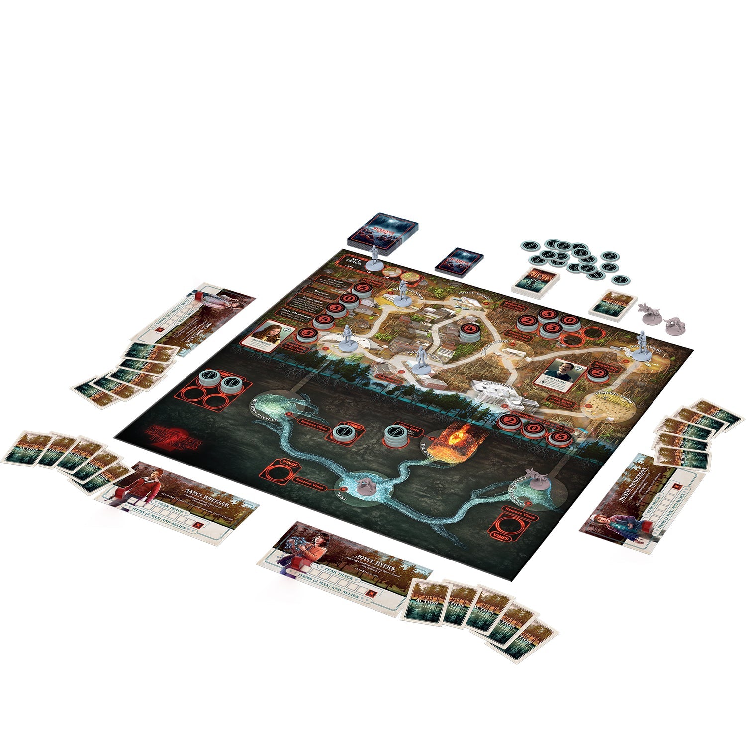 In Stranger Things: Upside Down, players take on the role of the kids of Hawkins who are trying to stop the operatives of the Hawkins National Laboratory and the evils from the Upside Down. Players must work together to clear stacks of tokens before time runs out. The game offers 2 seasons of play.