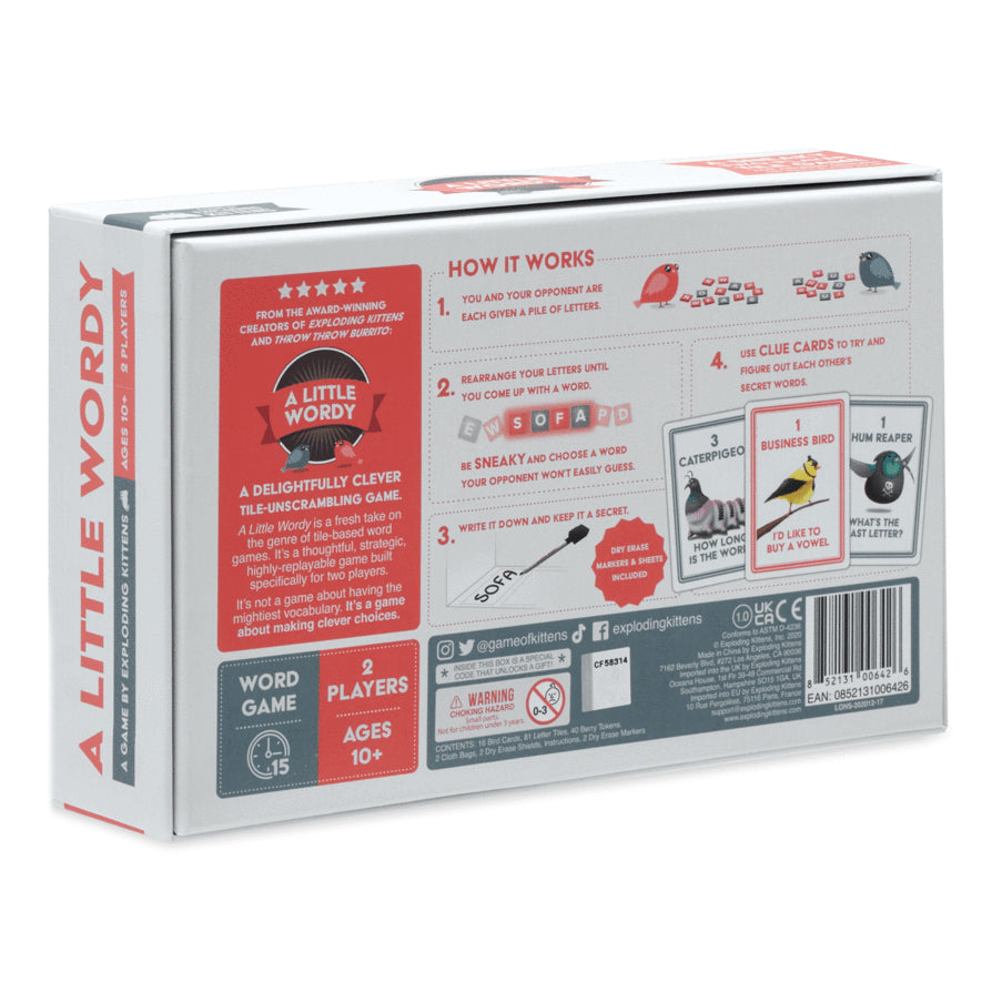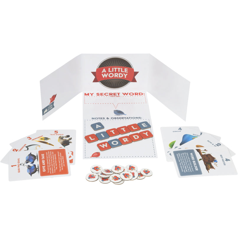 A Little Wordy is a fresh and clever take on the genre of tile-based word games. The game requires players to assemble a word from a set of tiles and keep that Secret Word to themselves. Both players then takes turns trying to decipher each other’s Secret Word by paying for clues and hints with berry tokens. Whoever has the most berry tokens at the end, WINS!