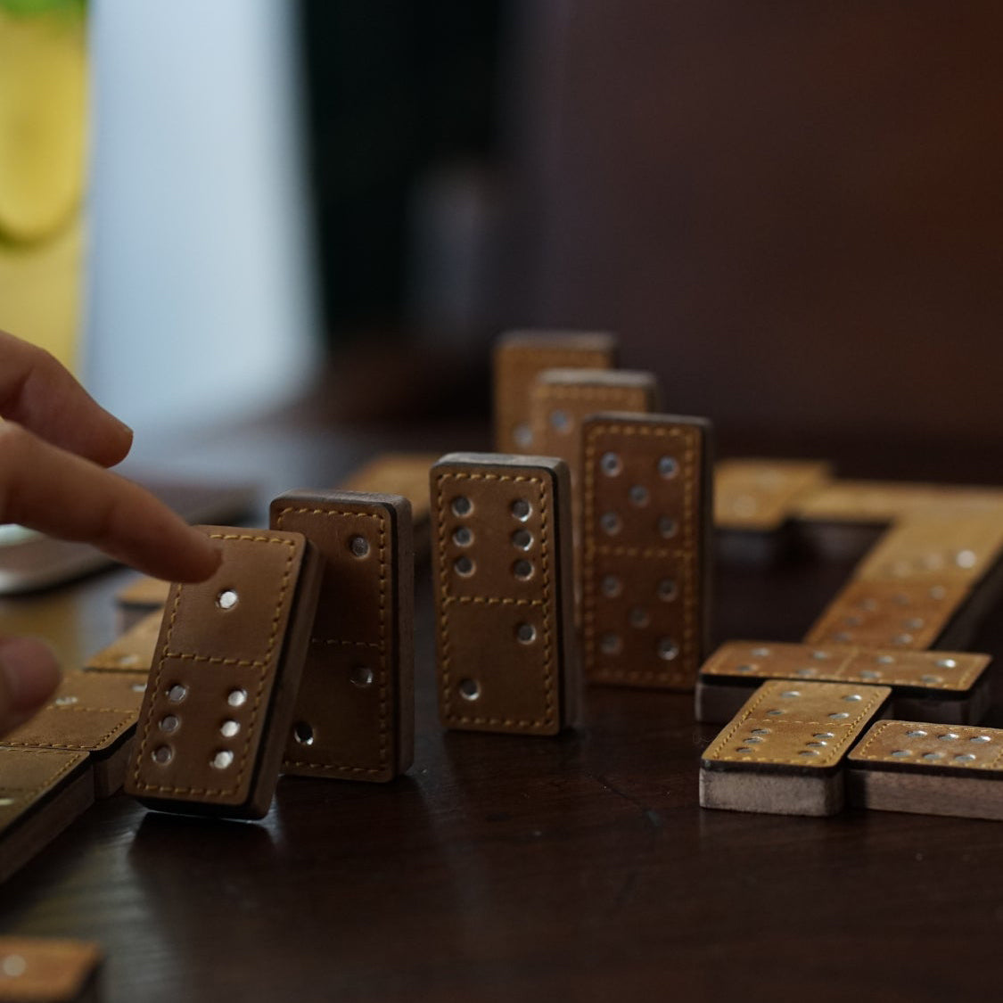 Dating back to the 18th century, our take on the domino game contains 28 pieces accented with heat-stamped waxy leather and the potential of a domino effect of excitement and happiness. This walnut-wood Leather Dominoes Set blends minimalism with a contemporary twist, with a leather design, and is fun to play with friends or family.