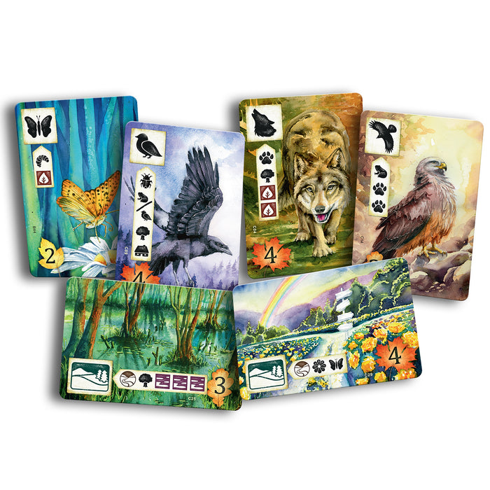 In Meadow, players collect ground cards (animal life habitats), observation cards (specific species observed during the journey), landscape and discovery cards (views and interesting souvenirs from their trips). The winner scores the most points in the obtained sets of cards and on the campfire board.