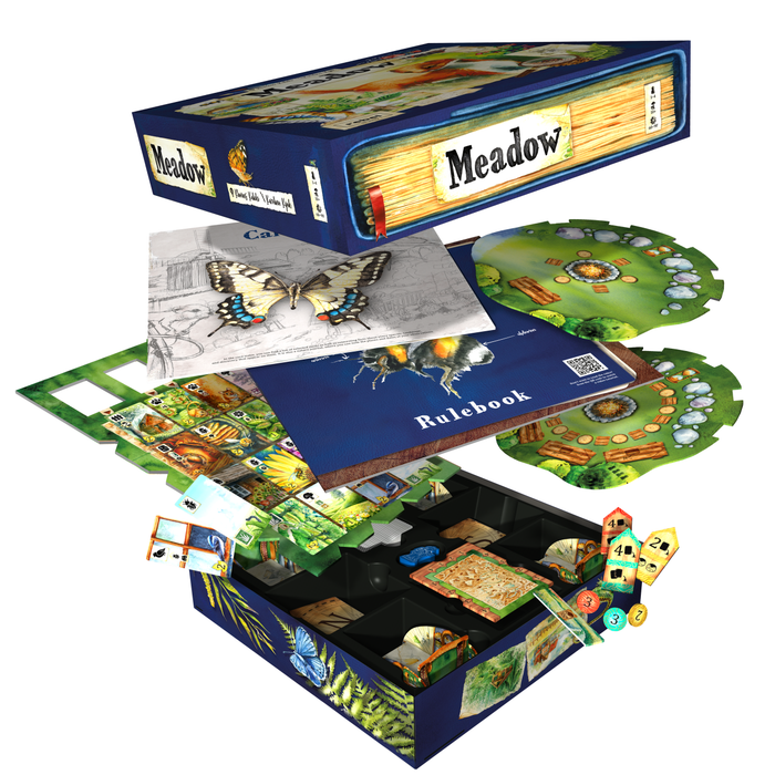 Meadow is a board game in which players take the role of wanderers watching nature. Equipped with a map, they stroll through the picturesque surroundings, looking for inspiration and capturing breathtaking views. Players are driven by passion and curiosity, but also by competition for the title of the keenest nature observer! It will be awarded to whoever scores the most points from the observed species of animals and plants, landscapes and souvenirs collected from the hike. Competition continues by the fire, where players compete in achieving the goals of their expeditions.