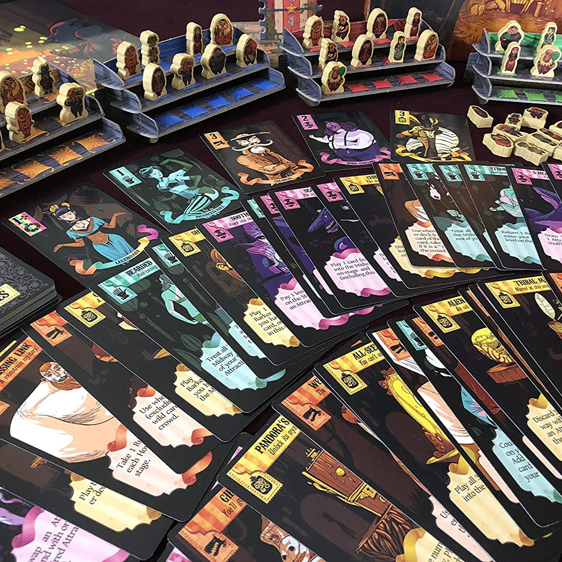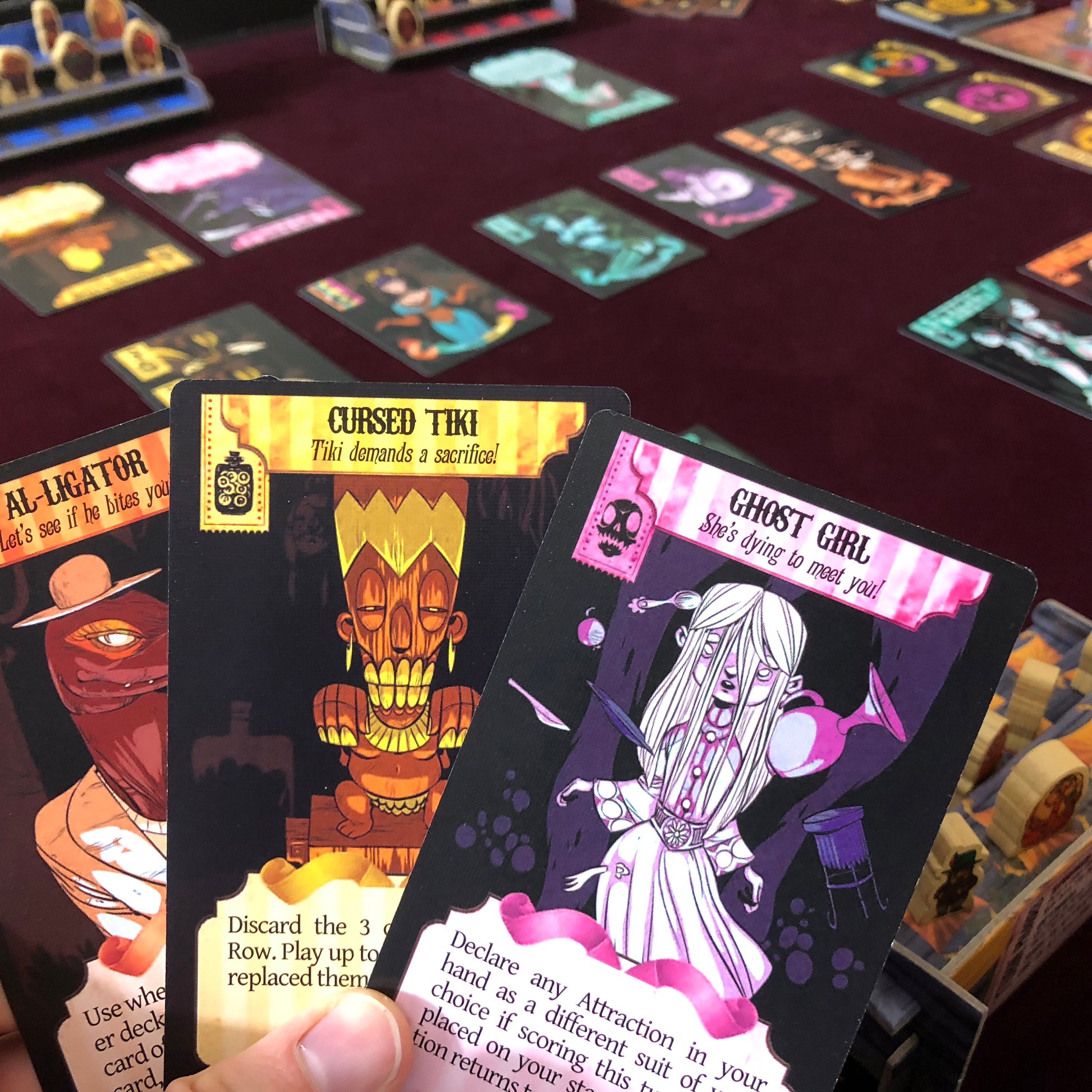 You draft these barker cards from a community pool and play them into the midway. Then you use those cards to play one of fifty or so attractions that will amaze and delight the rube meeples in your seats while giving you a special power to use later in the game. Stay tuned for some drafts of these attractions, such as Lobster Boy, Goose-Necked Girl, and the Fiji Mermaid. Each time you play an attraction, you climb higher on the strongman tower, making the next one harder to play, serving as an elegant and thematic catch-up mechanism. The player to first fill all their seats wins!