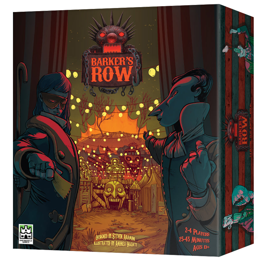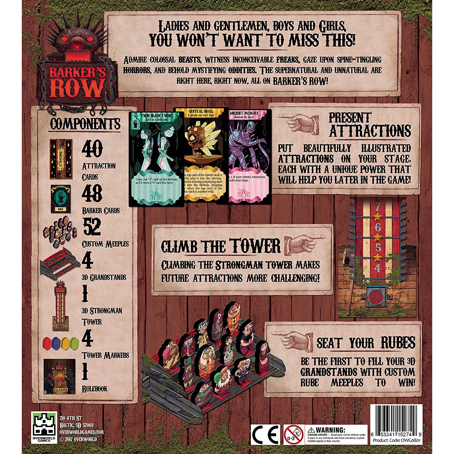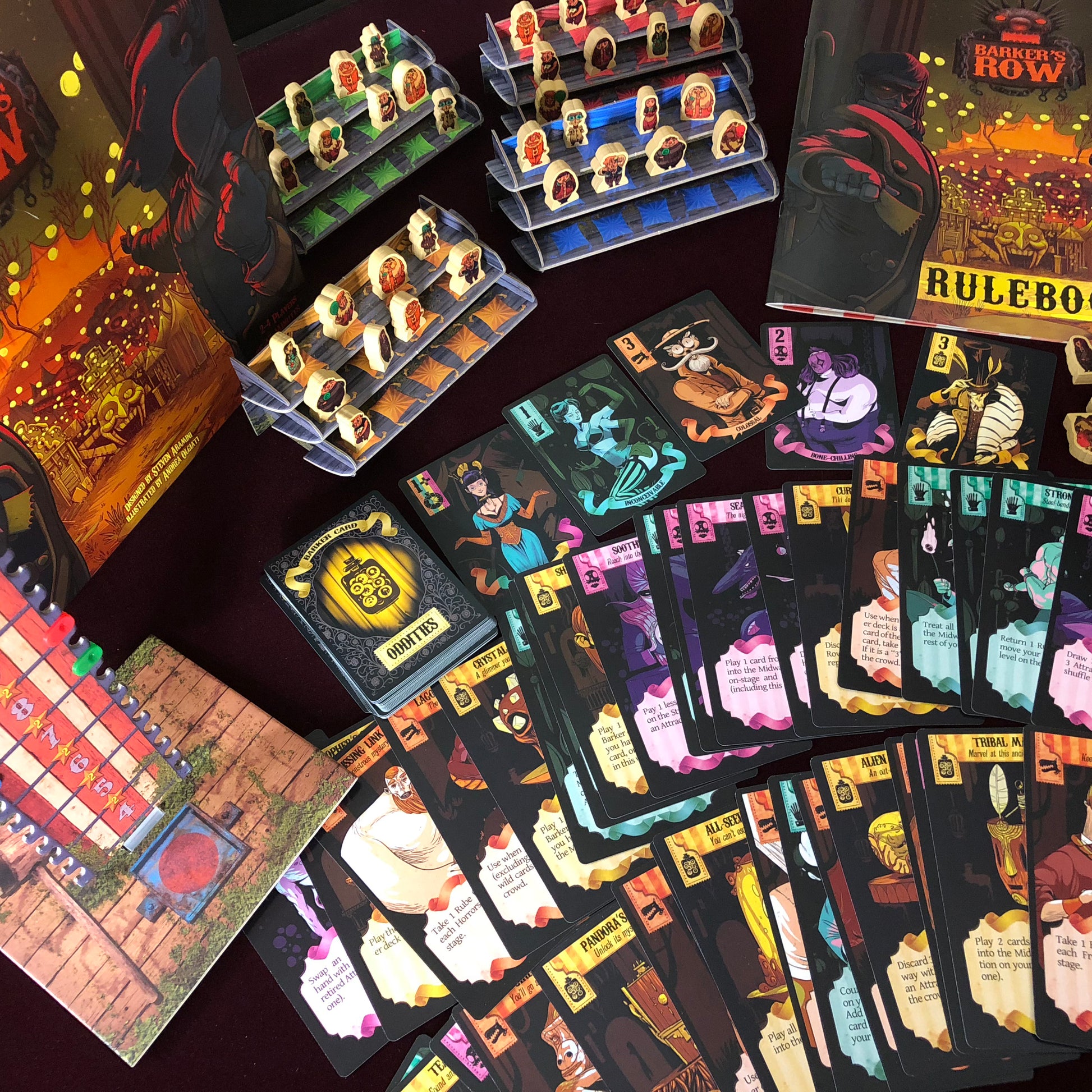 Barker's Row is a 2-4 player game in which you are a carnival barker trying to fill your 3D chipboard seats with "rube" meeples by playing the most fantastic attractions.