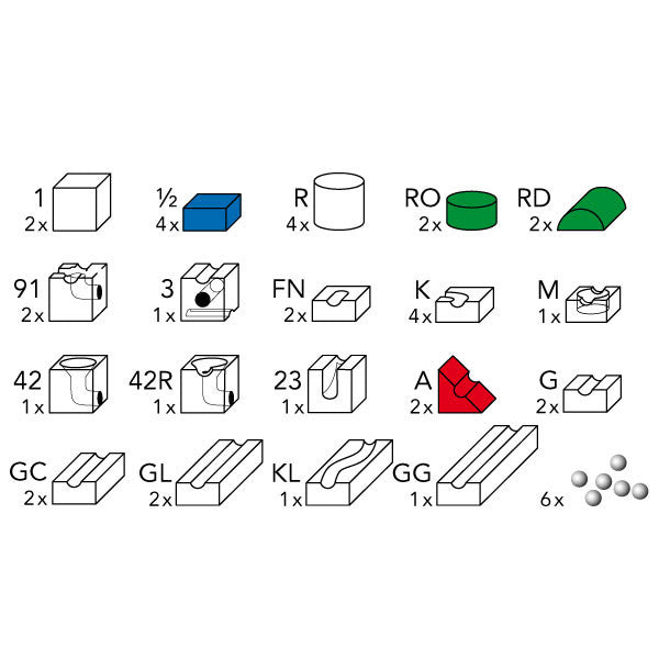 cugolino is a building set with solid, partly coloured elements for younger players to build simpler and more obvious marble tracks. Funnel-, round- and diagonal-shaped elements creates funny effects aiming at younger ages. The various elements can be combined with cuboro to make up countless track systems.