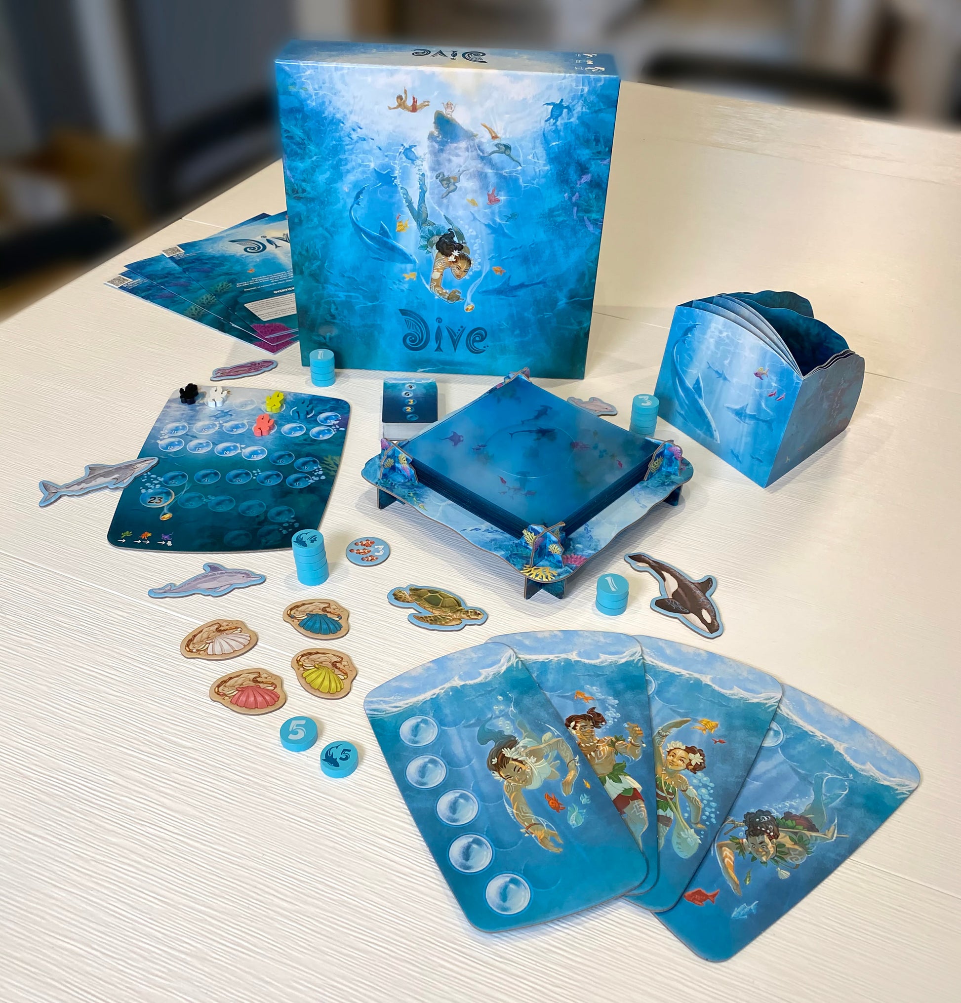 Dive explores the notion of perception, the ability of the divers to observe the ocean through a deck of transparent cards and to benefit from their observations. At the start of each round, you look into the "waters" before you to see how far you want to dive, with five levels being the maximum you can go (since you have five tokens). You then place the tokens on your board: