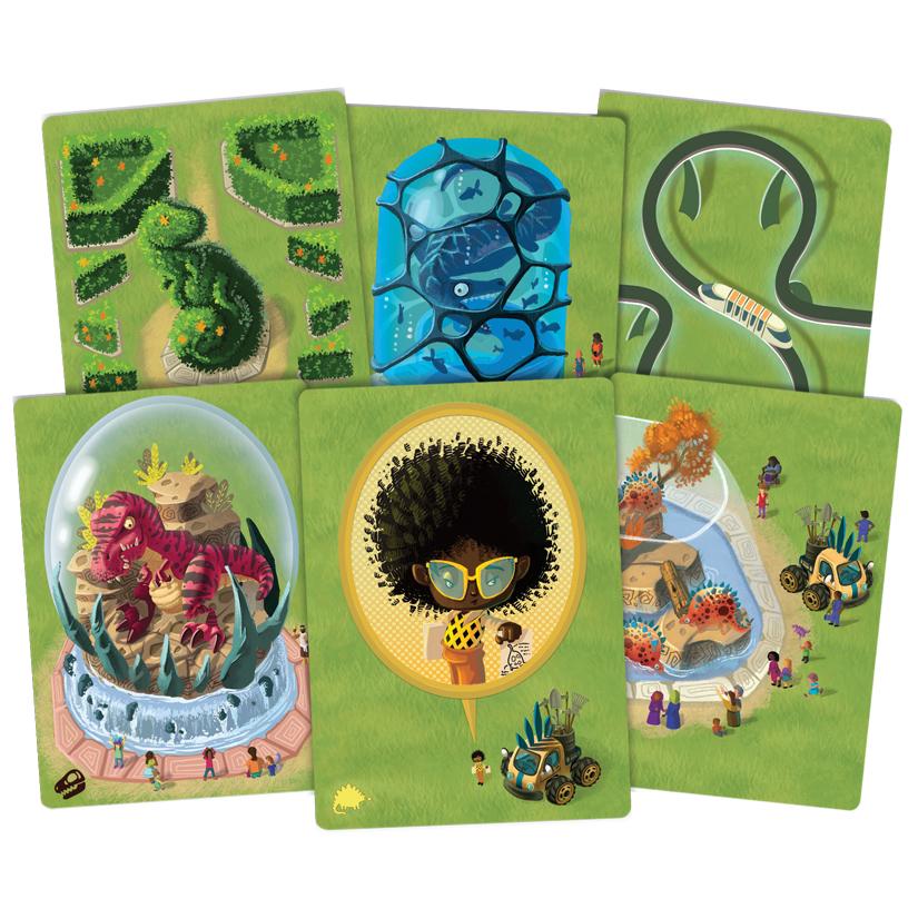 When drafting cards, you can choose to customize your zoo however you like. Choose from attractions, monorails, dinosaur enclosures, or topiary.