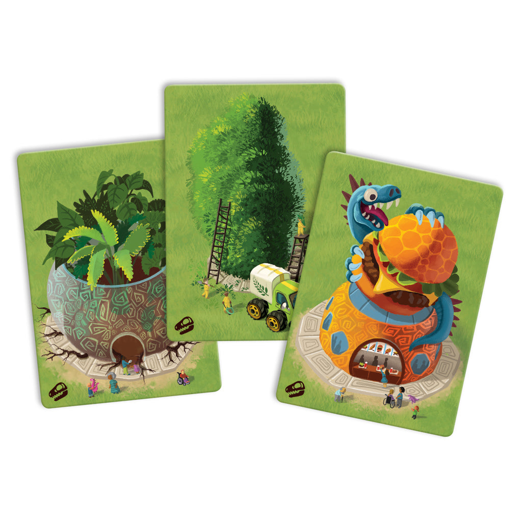 Thrill your dino zoo guests with new advanced features: the café, conservatory, and groundskeeper. Then play with the gargantuan Megazooic, a rules variant for playing with up to 12 players! This mini-expansion introduces three new advanced card types, all of which utilize the beautifully sculpted topiary found on certain basic cards as well as on every card back. Build cafés near shady topiary, place lovingly-cultivated conservatories, and utilize skilled groundskeepers to provide a touch of elegant flora to your dinosaur zoos.