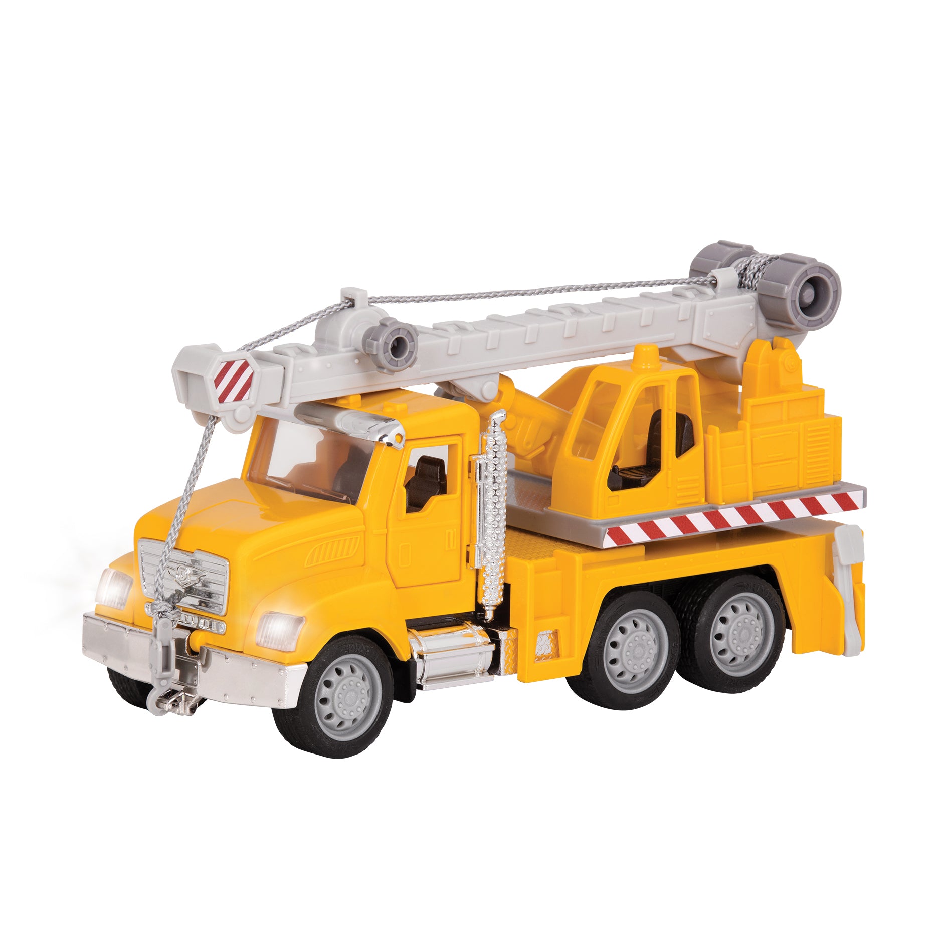 Crew members can rely on you and the Micro Crane Truck from Driven by Battat to do the heavy lifting! This toy construction truck has an extendable crane that swivels so you can move materials around easily on the construction site. It also has a retractable hook, so lifting and lowering will be a breeze! But before you head out to work, make sure to open the hood to check the engine. The doors also open so you can check out the cool interiors! To ensure everyone’s safety on the construction site, turn on your headlights and honk the horn by pressing on the roof. You’ll also hear realistic engine noises! This toy crane truck even has folding support legs to help get the job done right. Remember: stay DRIVEN, because the crew depends on you!