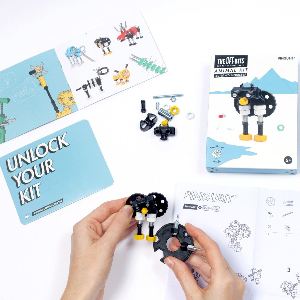 March through the cold of Antarctica with our PinguBit! Following the illustrated instructions easily transform a colorful selection of nuts, bolts, and unique hardware shapes into a vibrant new animal friend.