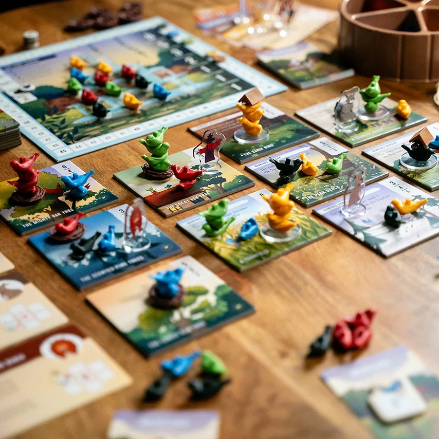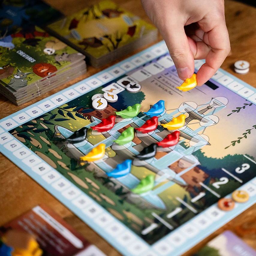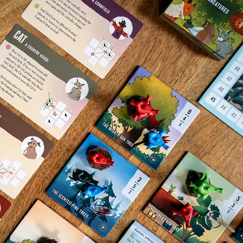 In Perch, players fight for control of locations by commanding birds of their own and other players’ flocks. Earn points and command woodland creatures by having the most birds on a location, pushing your foes off the perch, and breaking ties to take the lead.