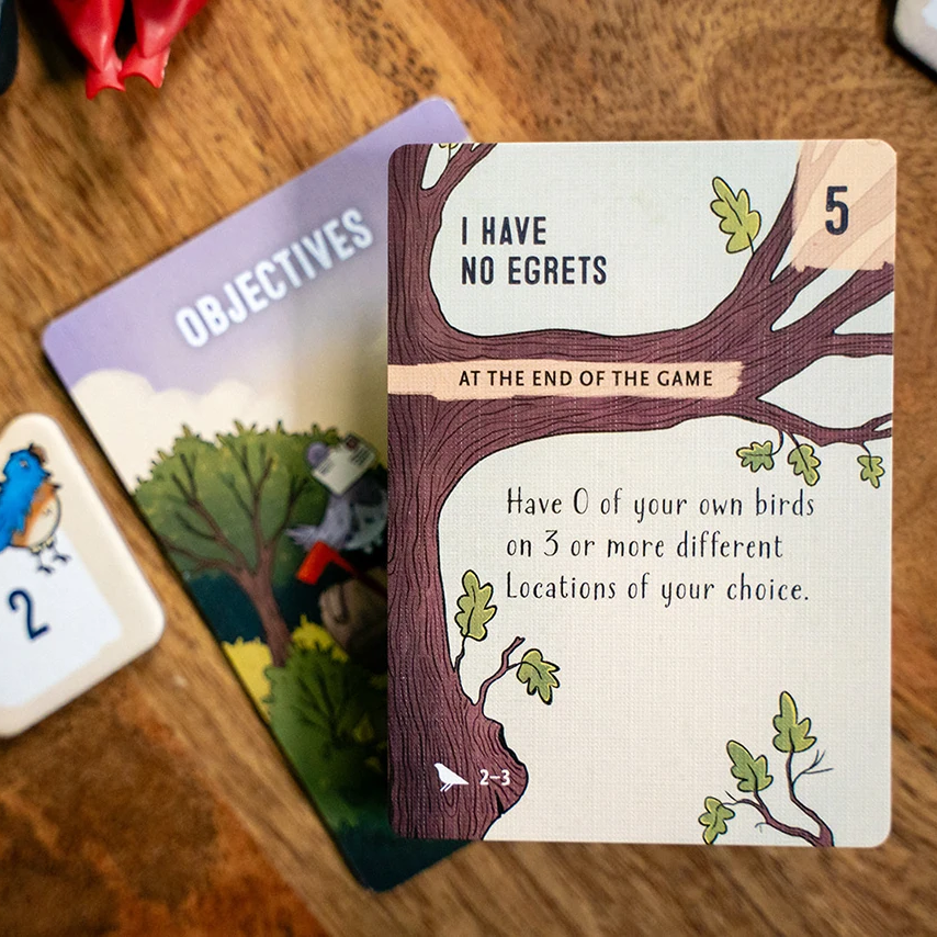 Each round, players add their birds into a shared bag. Players then draw birds of their own, and other players take turns stacking birds on location tiles. Each location tile will award variable points for majorities and sometimes grant players a unique ability. The game ends after five rounds, and the player who has earned the most points wins.
