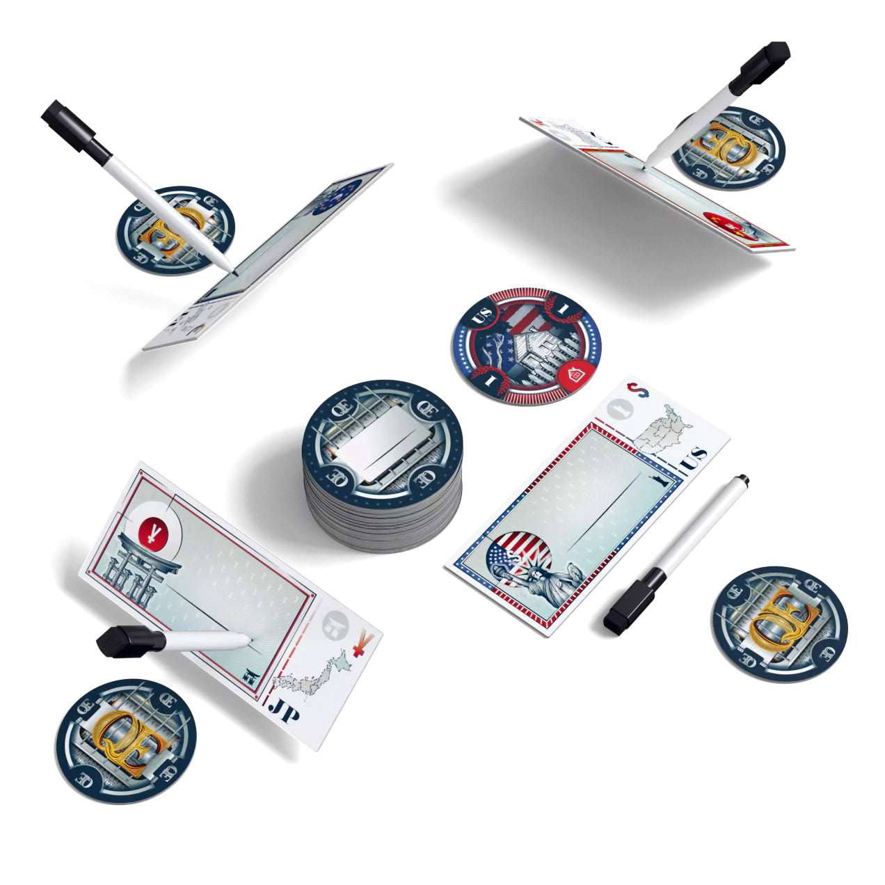 At the end of the game, total up all your winning bids by the amount of companies and special bonus points. Whoever has the most points wins. But be careful though - if you are the country who spends the most during the game, you’re out! It's a super interactive experience that turns auction gaming on its head.
