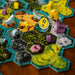 A clever action-selection mechanism drives your choices. Each action requires you to flip terrain tiles matching the terrain where you wish to take your action. These double-sided tiles mean the actions you take this round will set up which terrain types you can act on in the next round. As you take actions to expand your pack’s control of each region, you will also upgrade your pack’s attributes, allowing you to take more aggressive actions as the game goes on.