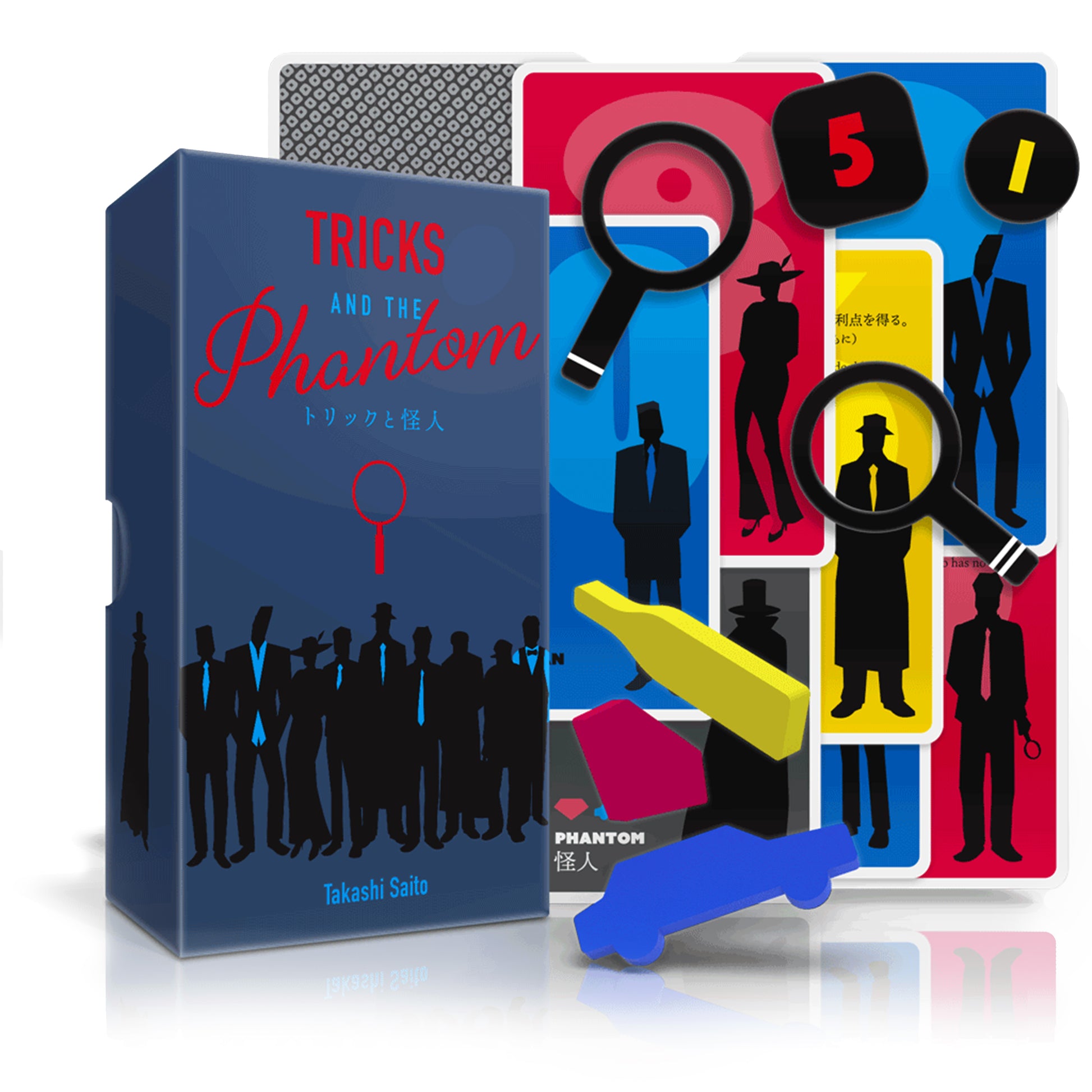 Tricks and the Phantom is a simple deduction game using only ten (or eleven) cards with a little bluffing element. Deduce the culprit from among the four persons. However, there may be a "phantom" who attempts to confuse you.