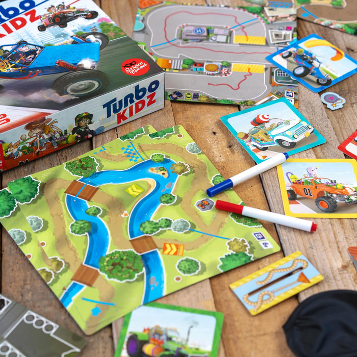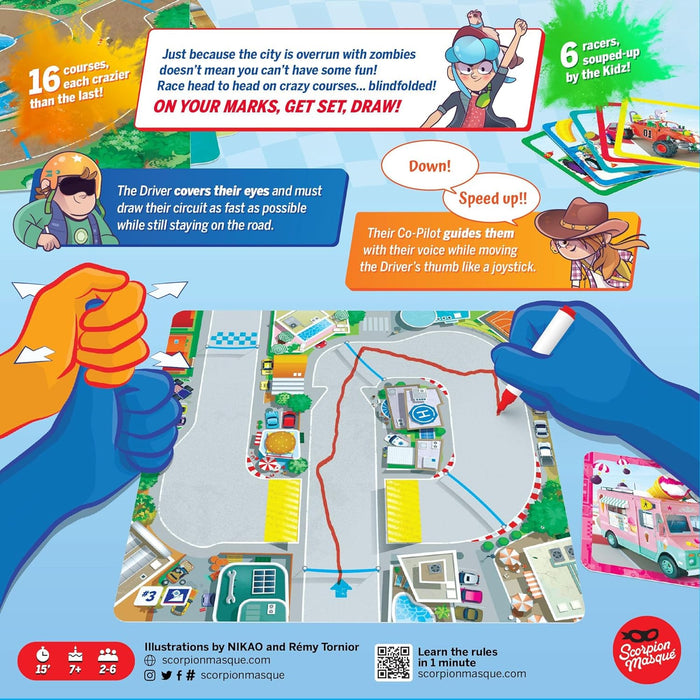 In Turbo Kidz, the Driver covers their eyes and must draw their circuit as fast as possible while still staying on the road. Their Co-Pilot guides them with their voice while moving the Driver’s thumb like a joystick and prevents them from going off the road!