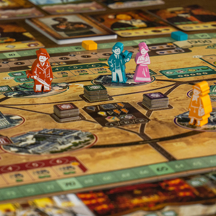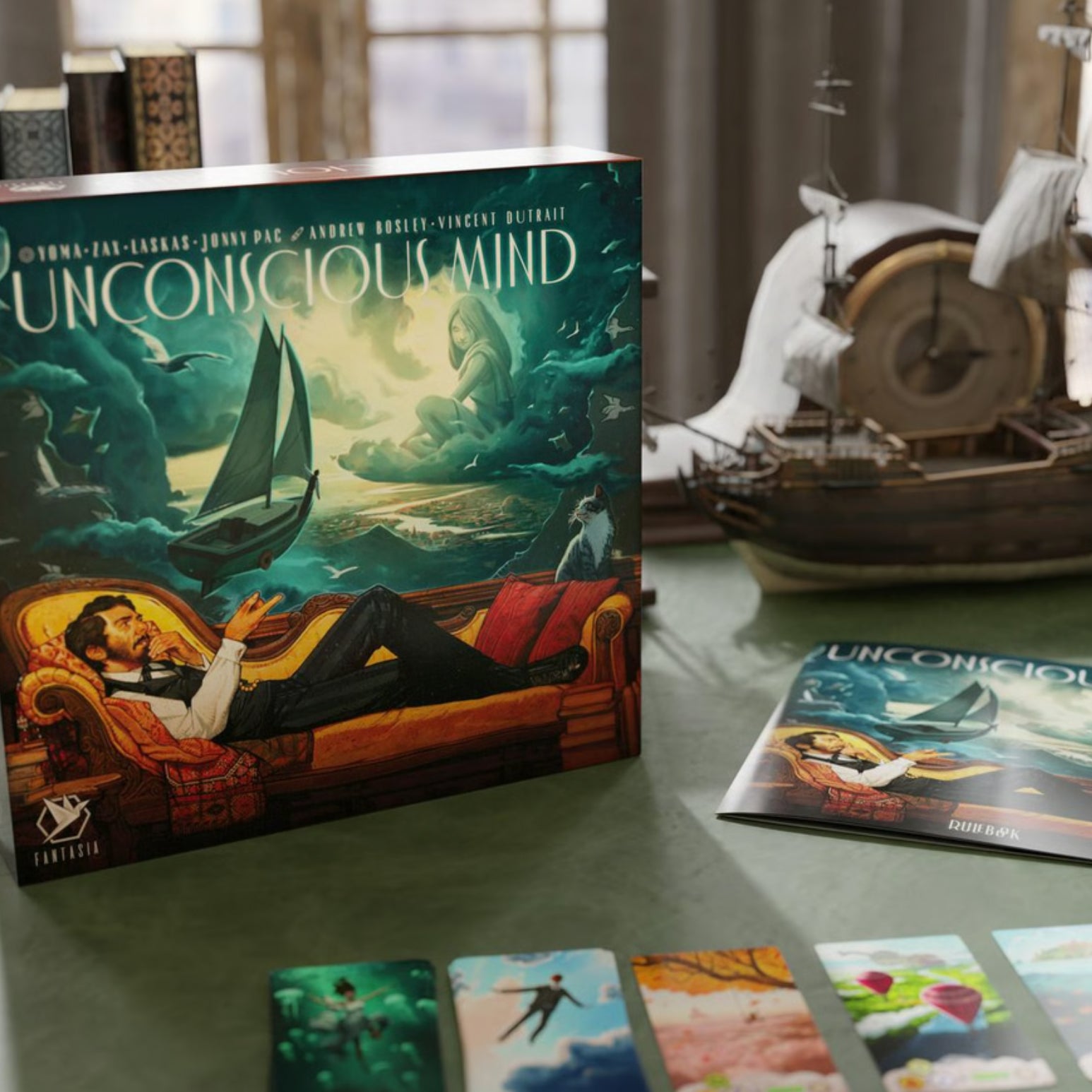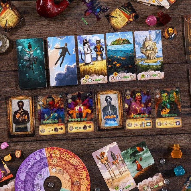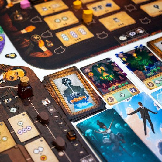 Unconscious Mind is a euro-style game featuring worker placement, engine building, multiple rondels, and cascading effects. On your turn, you may place one or two Ideas (workers) on a central Meeting Table to access a variety of actions, such as adding tiles to your player board, drafting and playing cards, and moving around the city of Vienna. Where you place your Ideas also determines how far to advance your rondel’s inkpot, activating a row or column of tile effects on your player board.