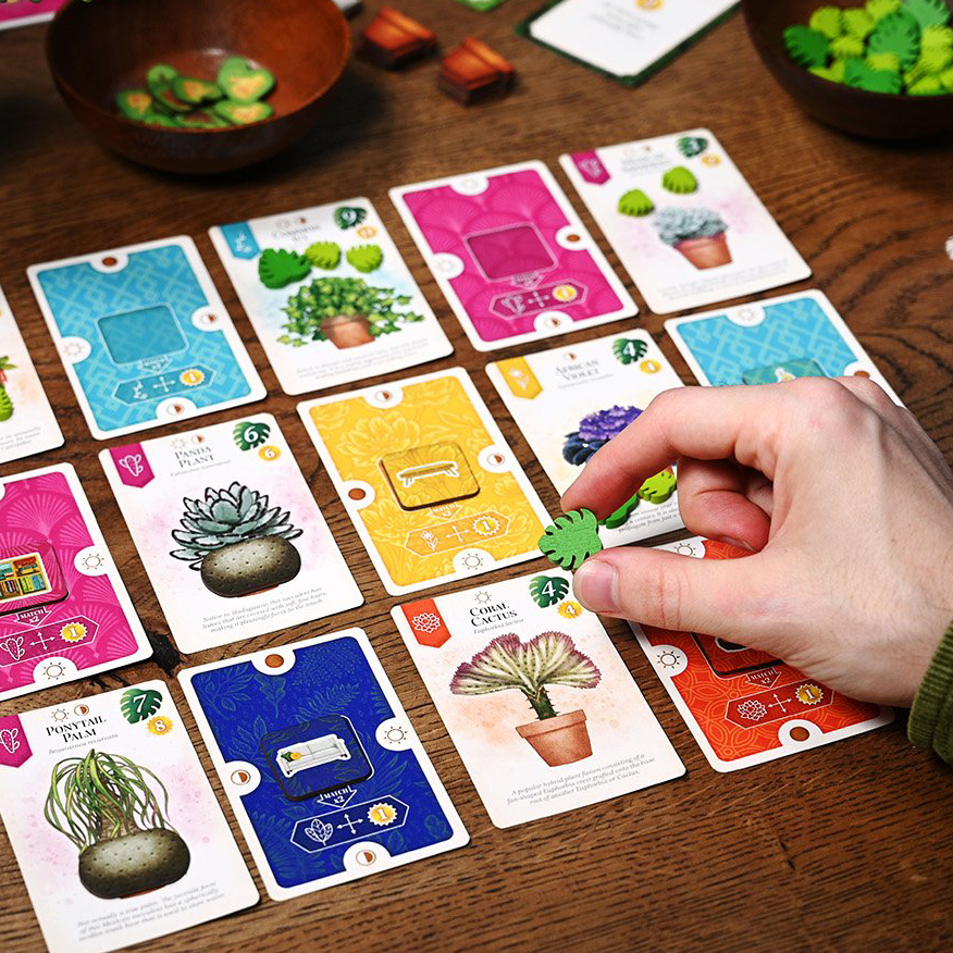 Turns are simple – select a card/token set and place each into your expanding home. Earn points by providing plants with the lighting conditions they desire, coordinating your interior space with furniture and pets, and racing against your opponents to pot plants and earn bonuses.